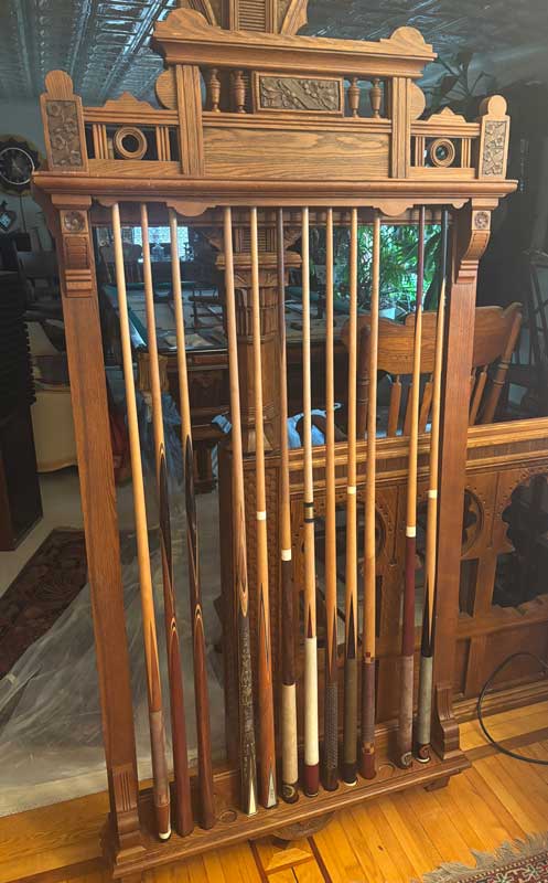 Item 30. Enhance your vintage game room with this rare, museum-quality antique Brunswick Manhattan cue rack, manufactured by the legendary Brunswick-Balke-Collender Co. during the 1890s. This “Manhattan” model serves as a stunning example of late-19th-century woodworking, featuring rich, aged oak and intricate period-correct carvings that reflect the golden age of billiards.