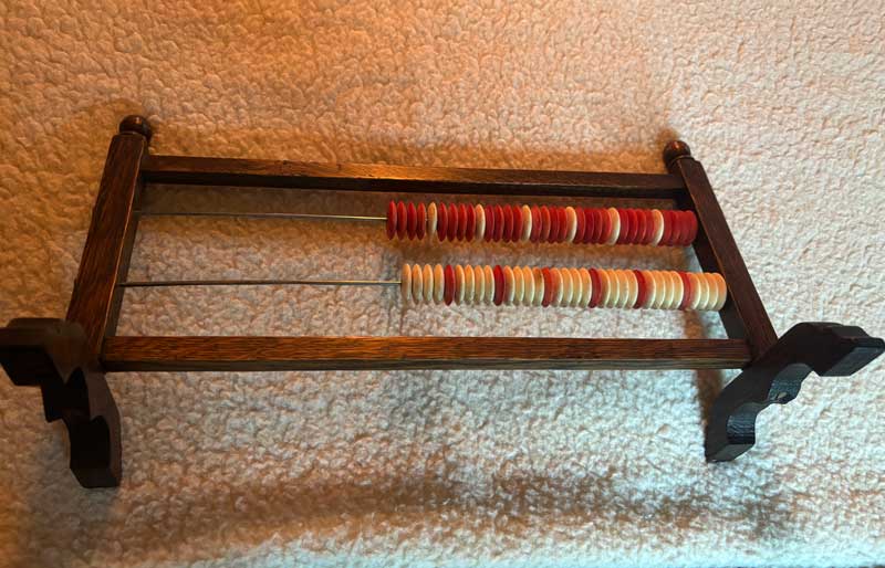 Antique mantle top style billiard scorekeeper c1900's. Made of oak with celluloid scoring beads. Red beads having surface dyed color. Size: 15 1/2" x 8 1/2". (Item 231)