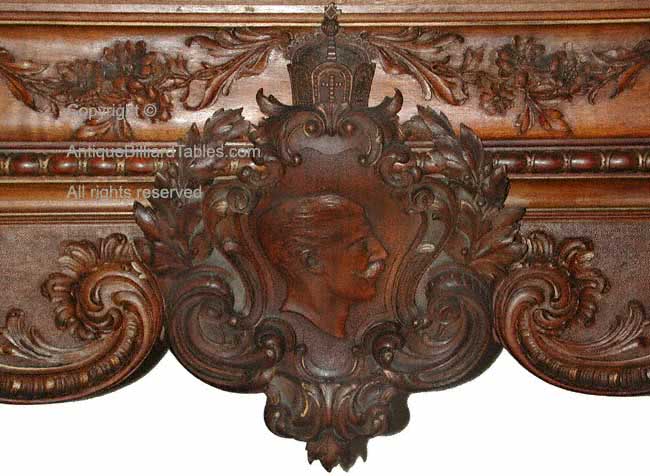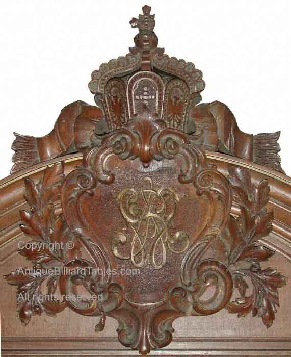 Achtung! This magnificent baroque billiard table and cue-stick cabinet are believed to have been owned by Kaiser Wilhelm. The side panels of this 7-foot billiard table are dominated by the profile of Kaiser Wilhelm. Prussia’s crowded imperial eagle is carved on the ends of the table, with lavish floral designs throughout. A craftsman’s inscription, “Louis Schulz, Berlin,” is found on the nickel-plated scorekeepers on the rail tops. The underlying playing surface is marble, the choice of the time. The 9-foot tall, 24-cue cabinet displays the Kaiser’s crown and initials at the top. Both the cabinet and the table feature original patina and gold leaf. The baroque walnut carving represents the refined and elaborate craftsmanship characteristic to the latter part of the 19th century. Kaiser Wilhelm Billiard Table, OD – 56”W x 96”L Kaiser Wilhelm #24 Billiard Cue Cabinet, OD – 44”W x 108”H Both Billiard pieces feature deep lavish walnut baroque carvings throughout |
